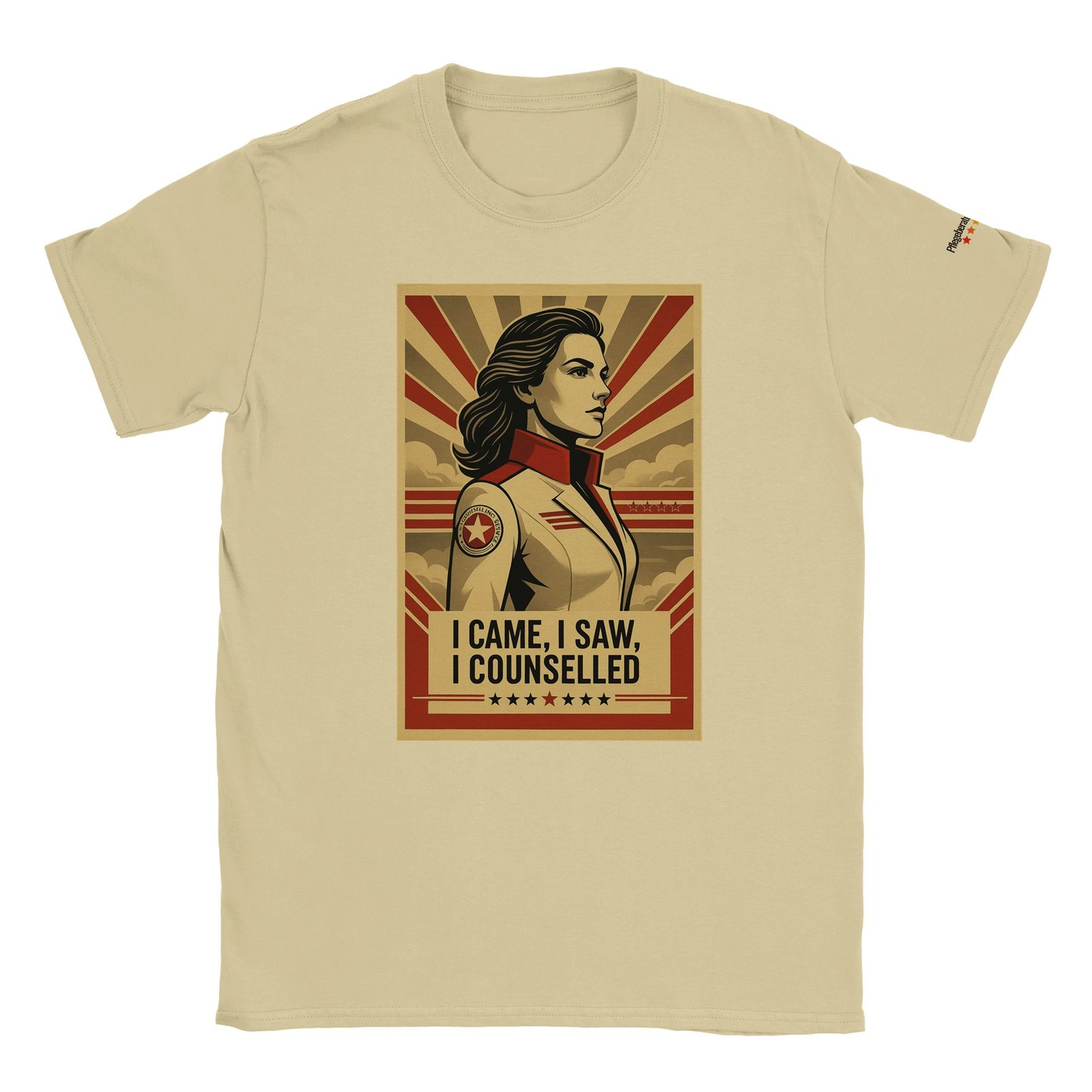 Heroisch & modern: Das stilisierte Retro-Artwork mit starker Symbolik, Sternen-Elementen und einer Pflegeberaterin im heroischen Look bringt den Spirit deiner Arbeit visuell auf den Punkt: selbstbewusst, entschlossen, professionell.